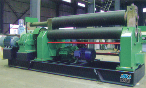 本機(jī)結(jié)構(gòu)為三輥對(duì)稱式,上輥在兩下輥中央對(duì)稱位置作垂直長(zhǎng)降運(yùn)動(dòng),通過(guò)絲桿絲母蝸桿,傳動(dòng)而獲得,兩下輥?zhàn)餍D(zhuǎn)運(yùn)動(dòng),通過(guò)減速機(jī)的輸出齒輪與下輥齒嚙合,為卷制板材提供扭矩。